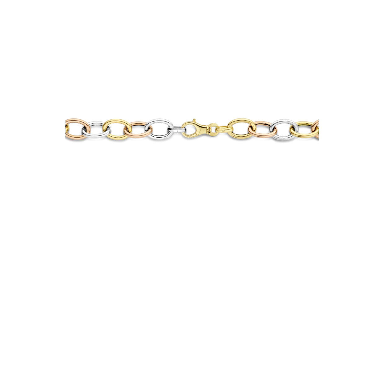 14k Tricolor wit- rose- en geelgouden collier. Het collier heeft een draaglengte van 45.5cm en een schakelbreedte van 10mm. Uitgevoerd met een karabijn sluiting.