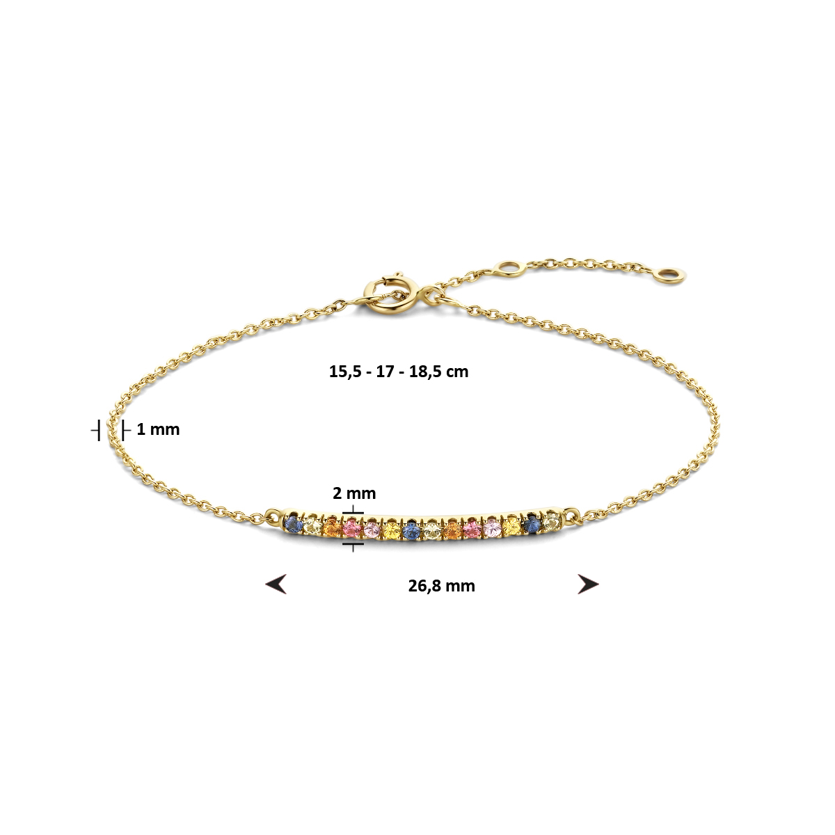 14k Geelgouden armband uitgevoerd met een schitterende regenboog saffier rij. De armband heeft draaglengtes van 15.5, 17 en 18.5cm. De schakelbreedte is 1.0mm. De saffier stenen hebben een totaal steengewicht van 0.28ct.