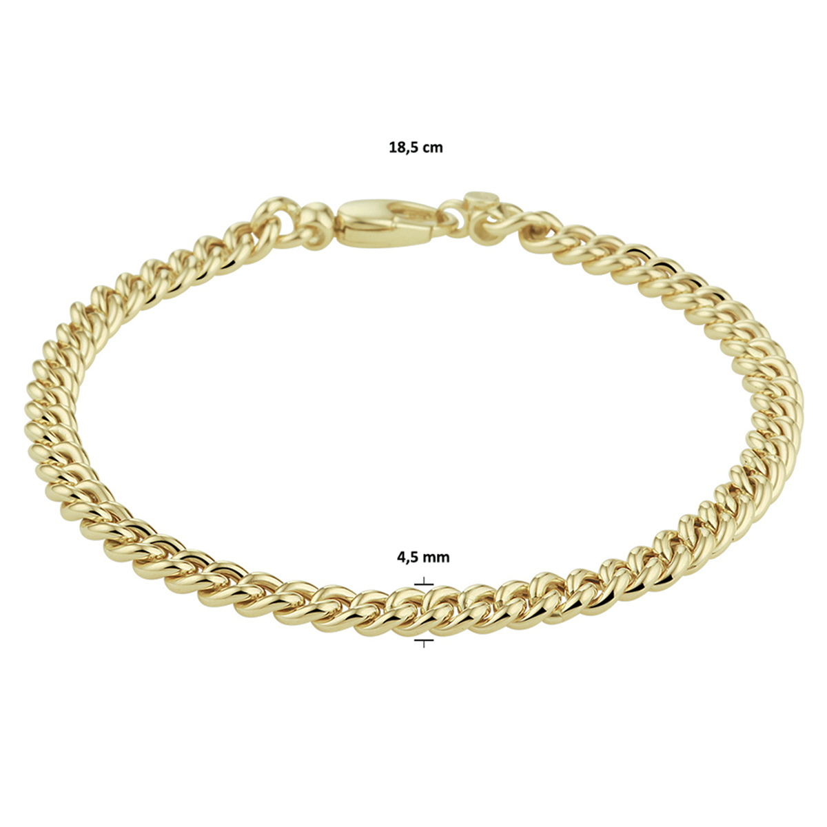 Grovere schakels zijn trendy! Daarom mag deze gourmet armband niet ontbreken in je assortiment! De 14k geelgouden holle schakel heeft een breedte van 4,5 mm en is 18,5 cm lang. De sluiting is een stevige karabijn. Leuk om te combineren met een bangle of fijne armband.