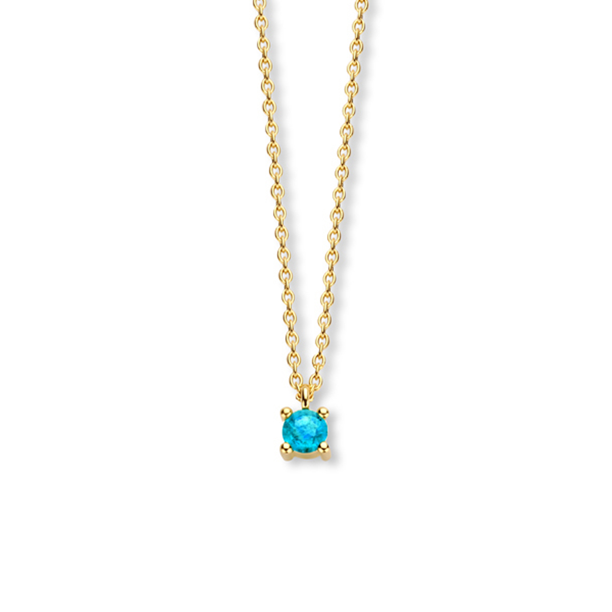 14k Geelgouden collier met een aquamarijn geboortesteen. De aquamarijn heeft een steengewicht van 0.20ct. Het collier heeft draaglengtes van 40, 42 en 44cm. De schakelbreedte is 1.0mm.