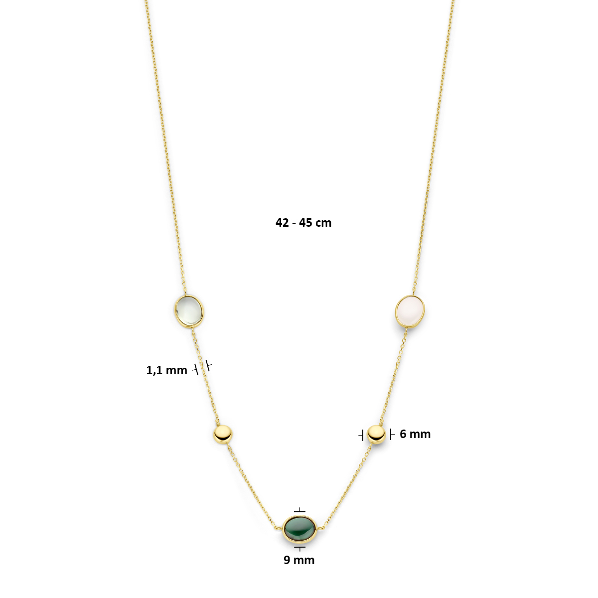14k Geelgouden collier uitgevoerd met wit aventurijn, groen amethist en groen toermalijn kwarts. Het collier heeft draaglengtes van 42-45cm. De schakelbreedte is 1.1mm.