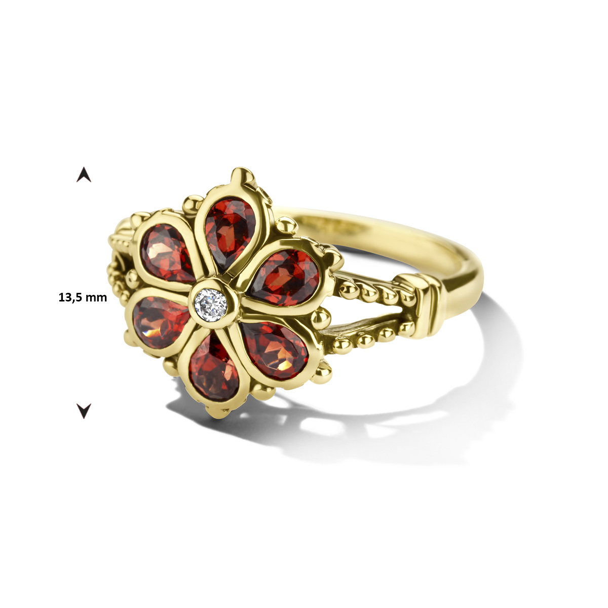 14k Geelgouden ring uitgevoerd met schitterende granaat stenen en een diamant. De granaat stenen hebben een totaal steengewicht van 0.19ct. De ring heeft een breedte van 13.5mm.