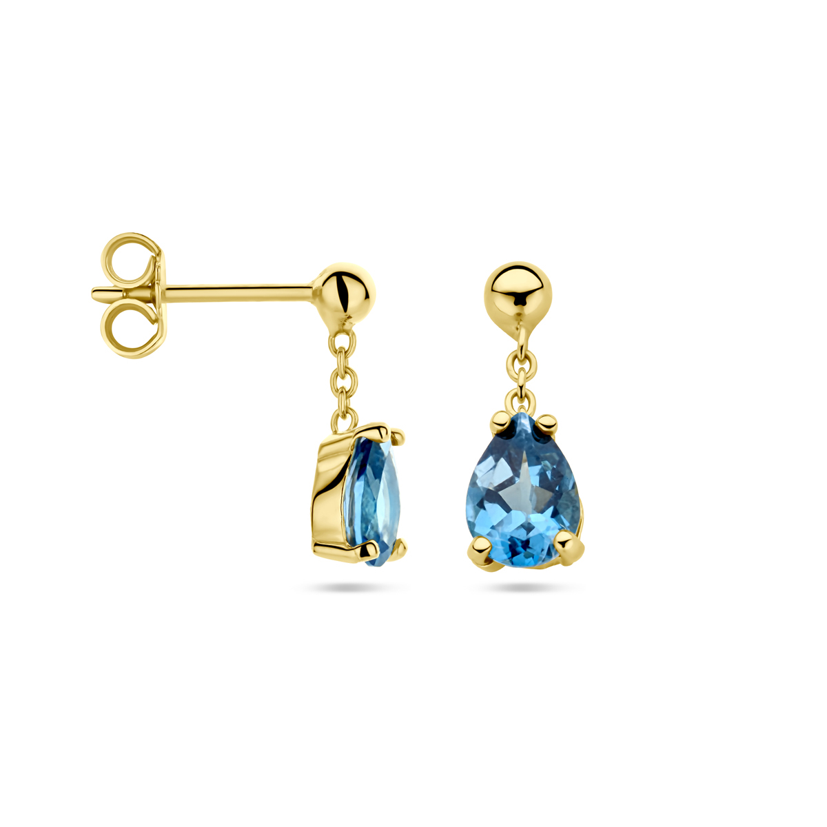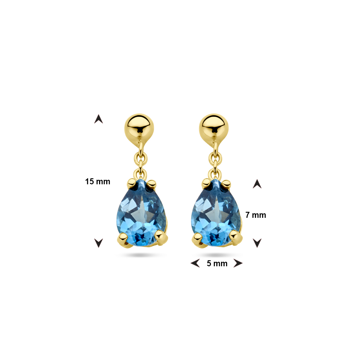 14k Geelgouden oorhangers uitgevoerd met london blue kwarts. De oorhangers hebben een totale hoogte van 15mm.