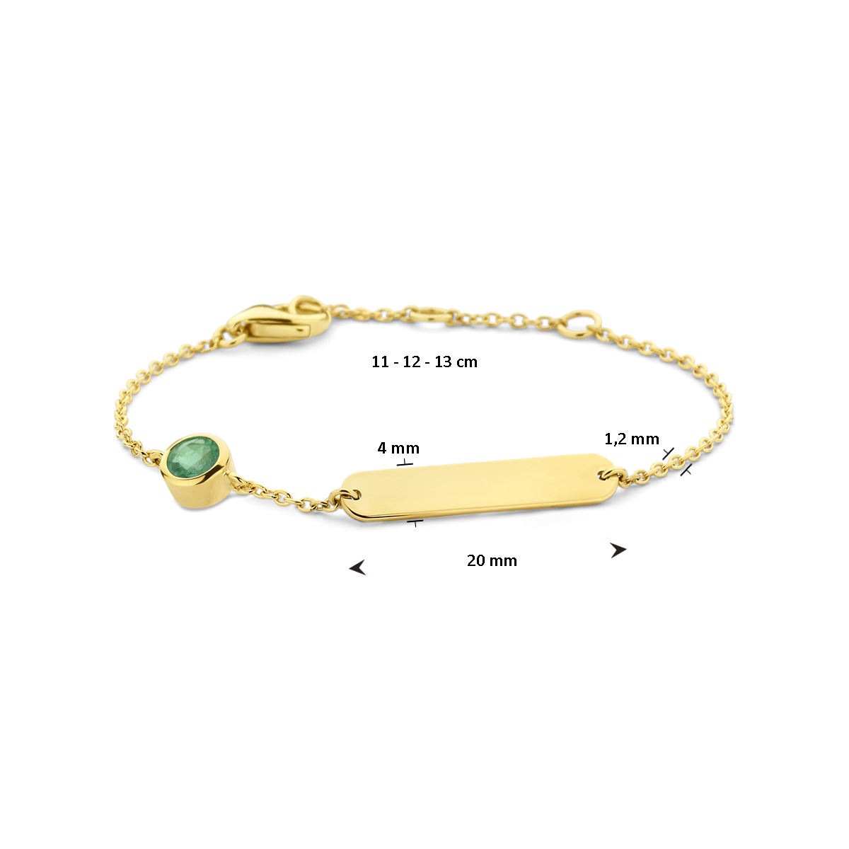 14k Geelgouden graveerarmband uitgevoerd met een schitterende kleursteen. De armband heeft draaglengtes van 11-12-13cm. De schakelbreedte is 1.2mm. De graveerplaat heeft een afmeting van 4x20mm en een dikte van 0.8mm.
