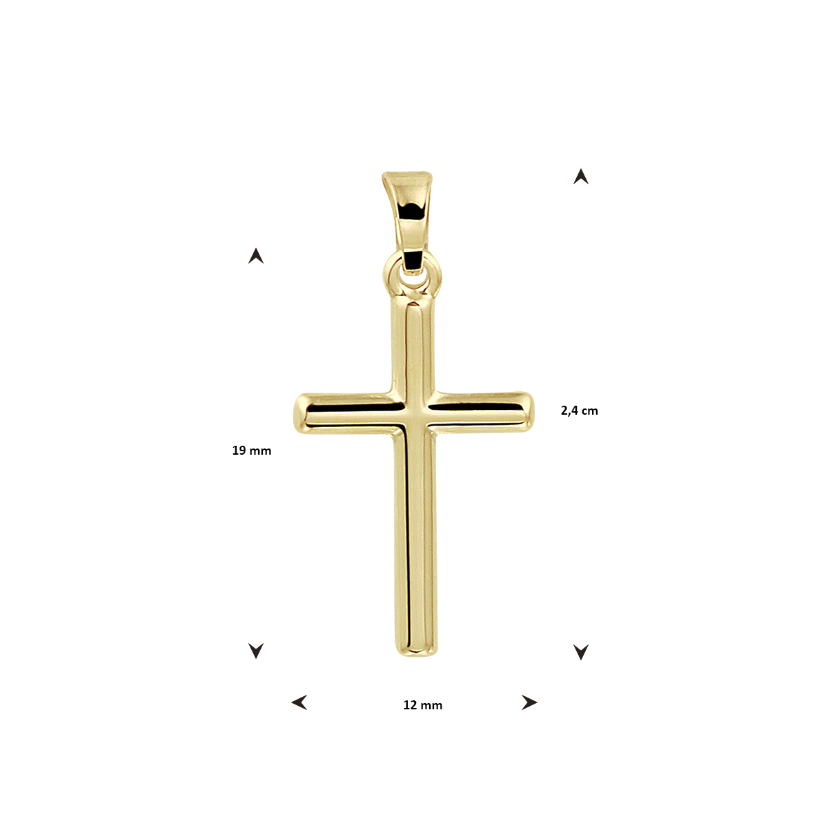 14k Geelgouden hanger uitgevoerd in de vorm van een kruis. De hanger heeft een totale hoogte van 2.4cm en een breedte van 12mm.