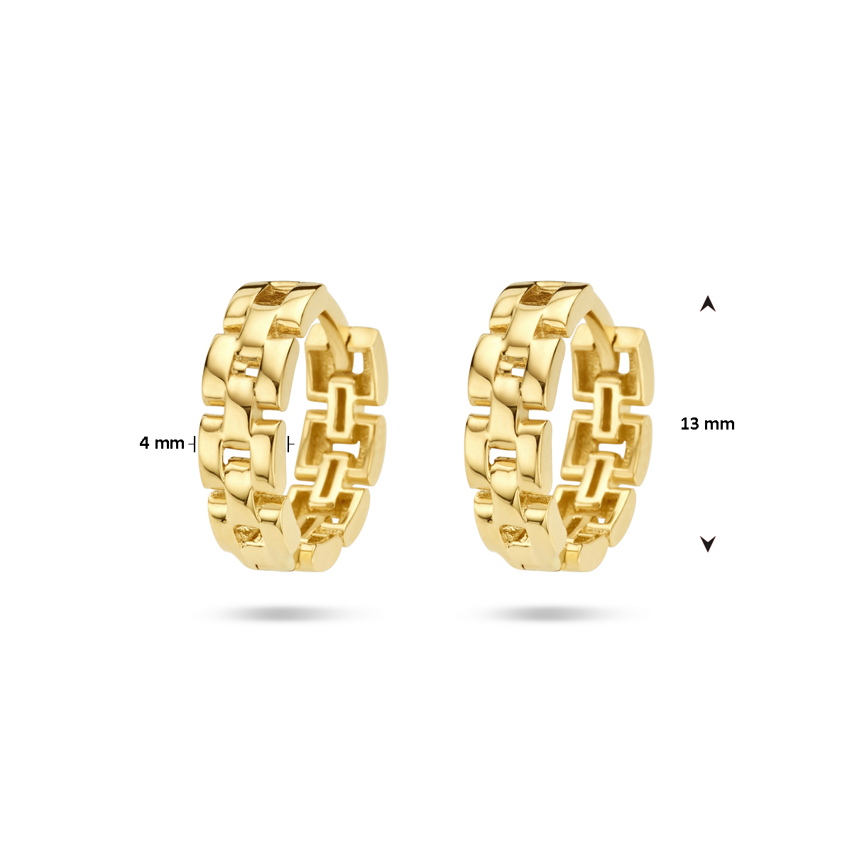 14k Geelgouden klapoorringen met een schakelmotief. De oorringen hebben een diameter van 13mm en zijn voorzien van een scharniersluiting