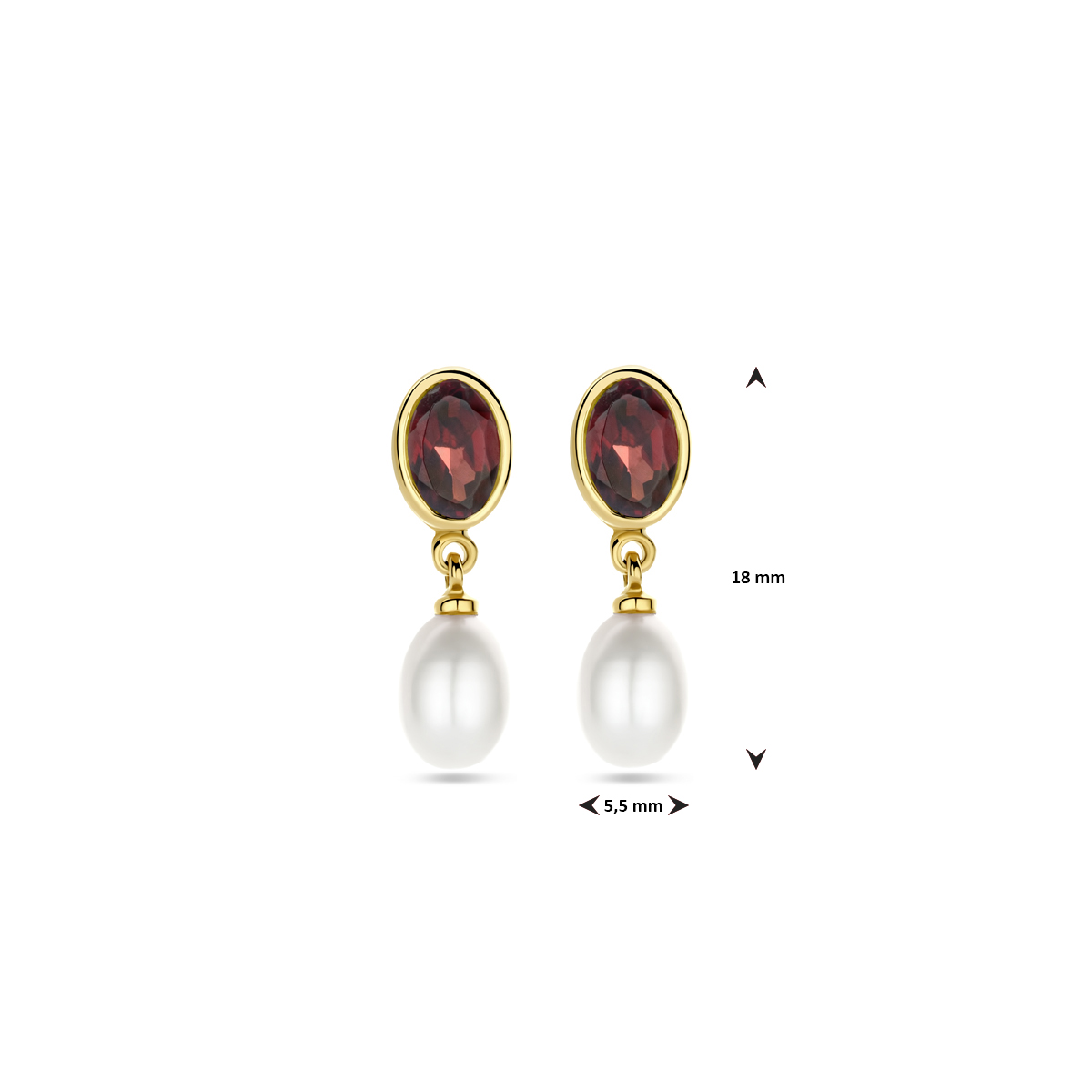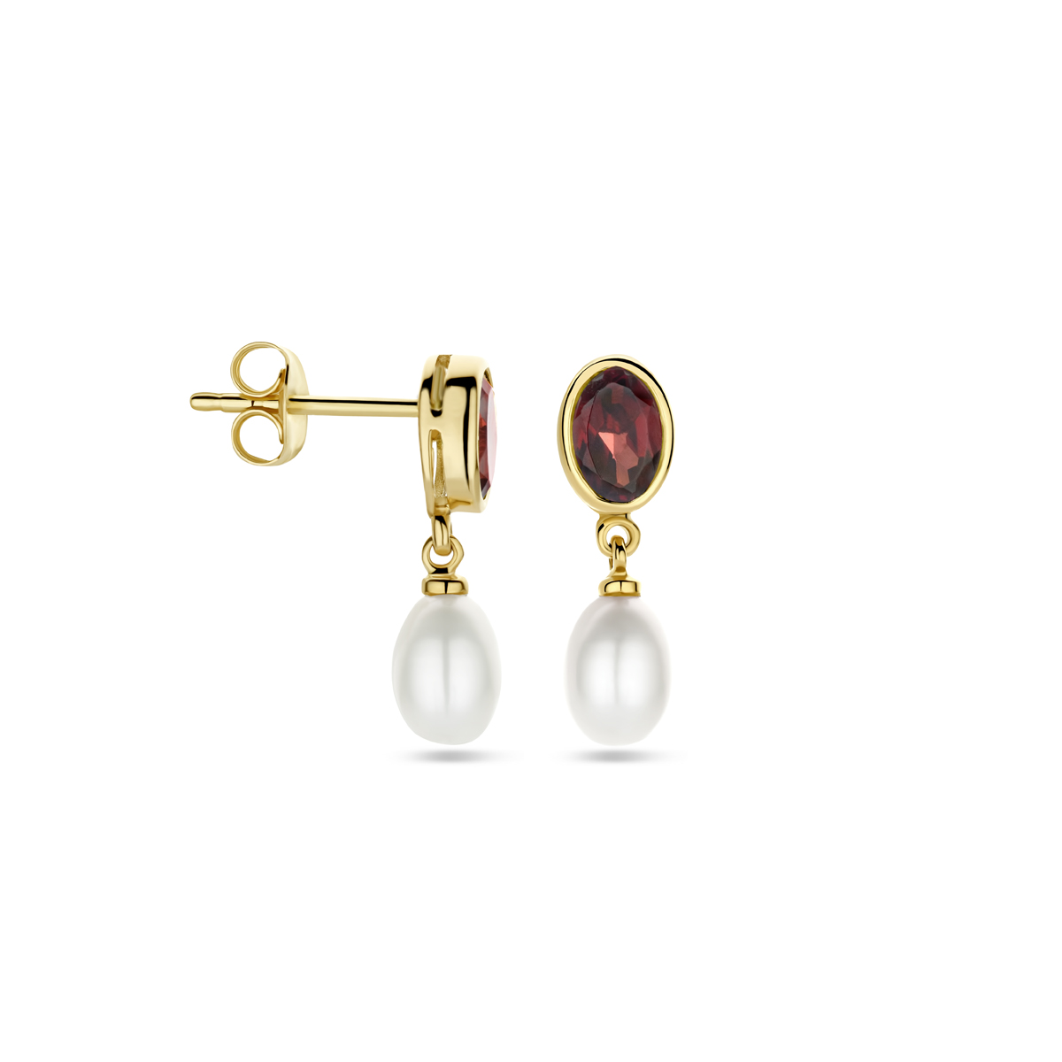 14k Geelgouden oorhangers uitgevoerd met zoetwaterparel en granaat. De oorhangers hebben totale hoogte van 18mm. De parel heeft een afmeting van 8x5.5mm.
