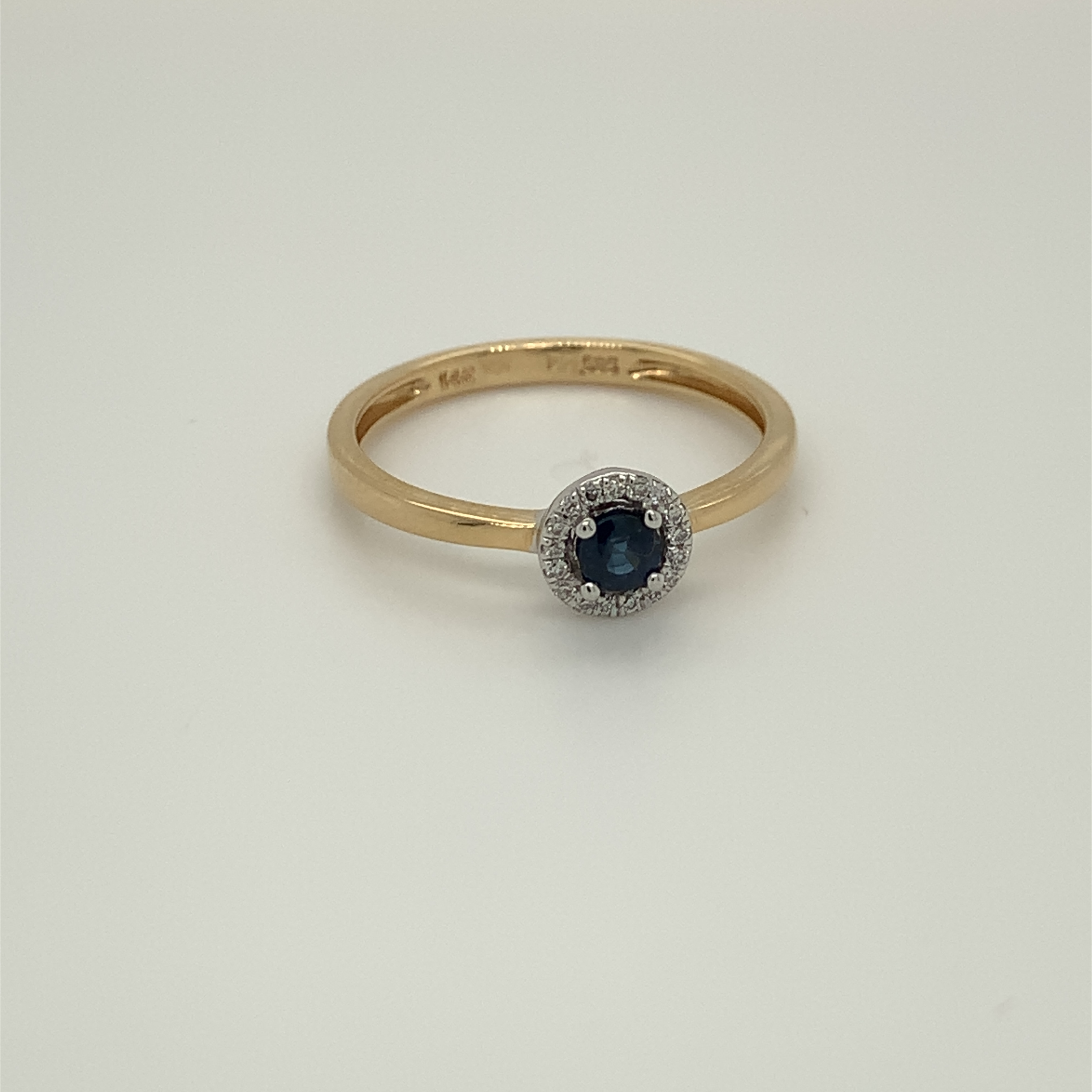 Mooie 14krt gouden ring met briljant en saffier 17-0.05/1-0.21 crt