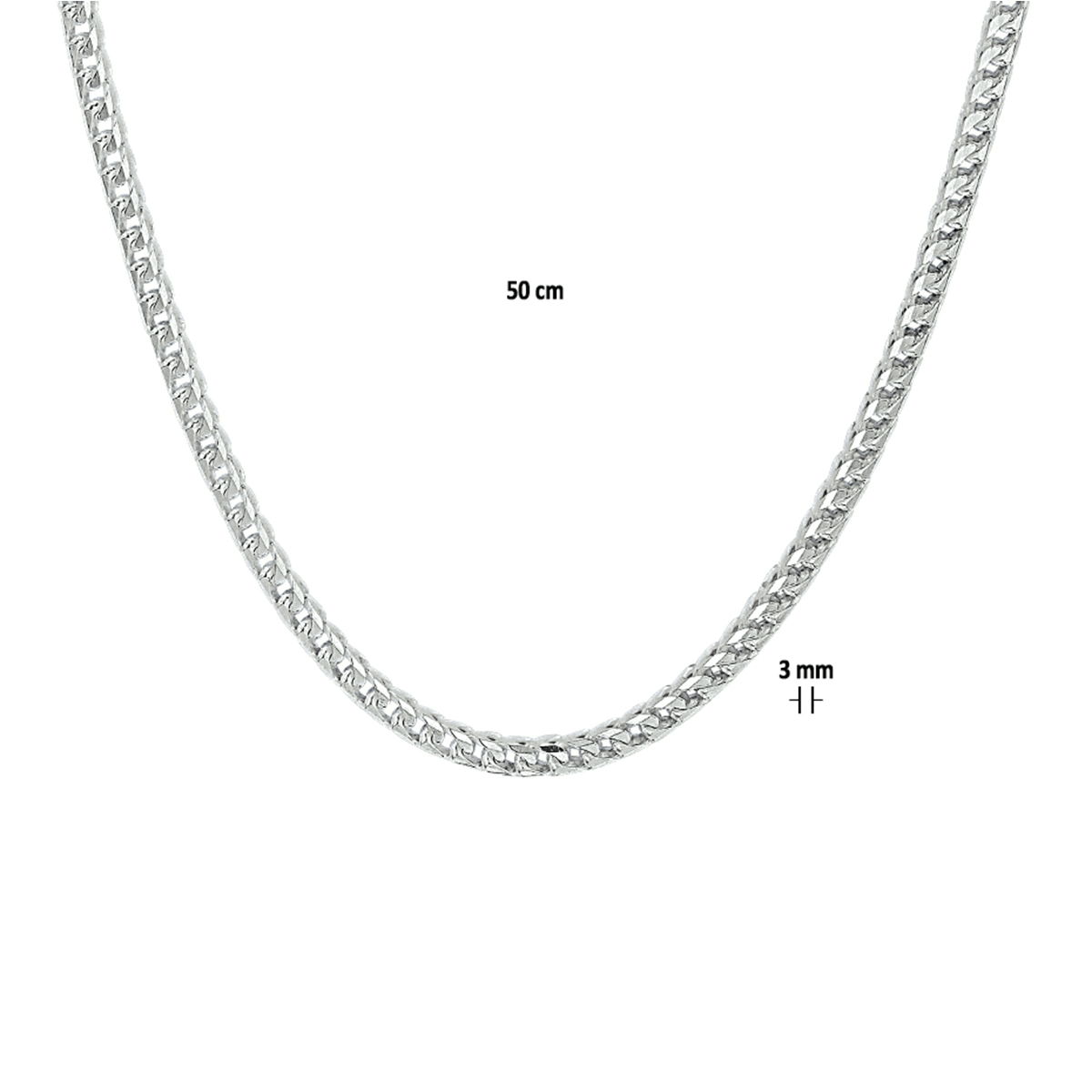 Beschrijving: Zilveren collier met een gourmet schakel. Het collier heeft een schakelbreedte van 3mm en een draaglengte van 50cm. Uitgevoerd met een karabijn sluiting.