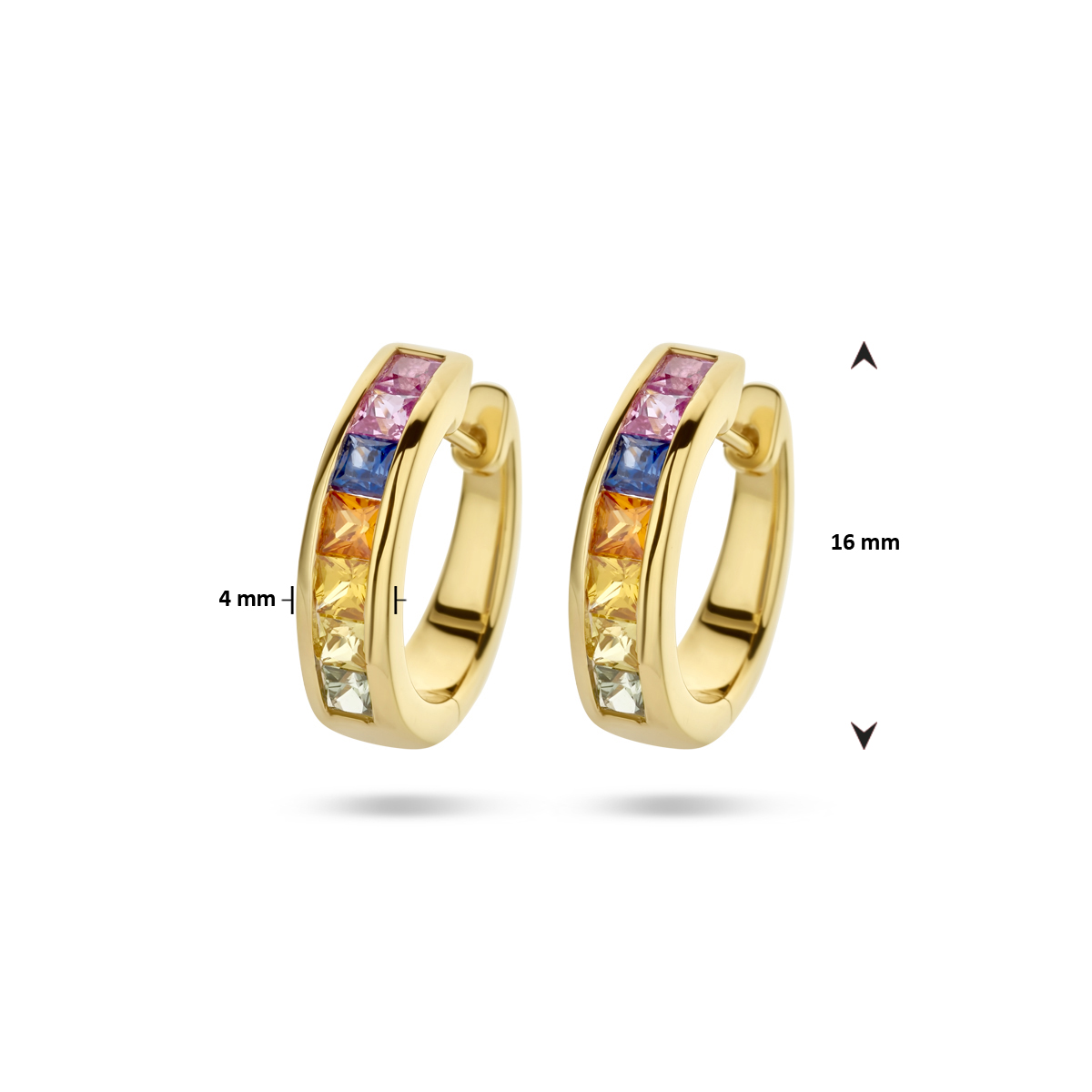 14k Geelgouden klapoorringen uitgevoerd met saffier in verschillende kleuren. De oorringen hebben  een afmeting van 16x4mm.