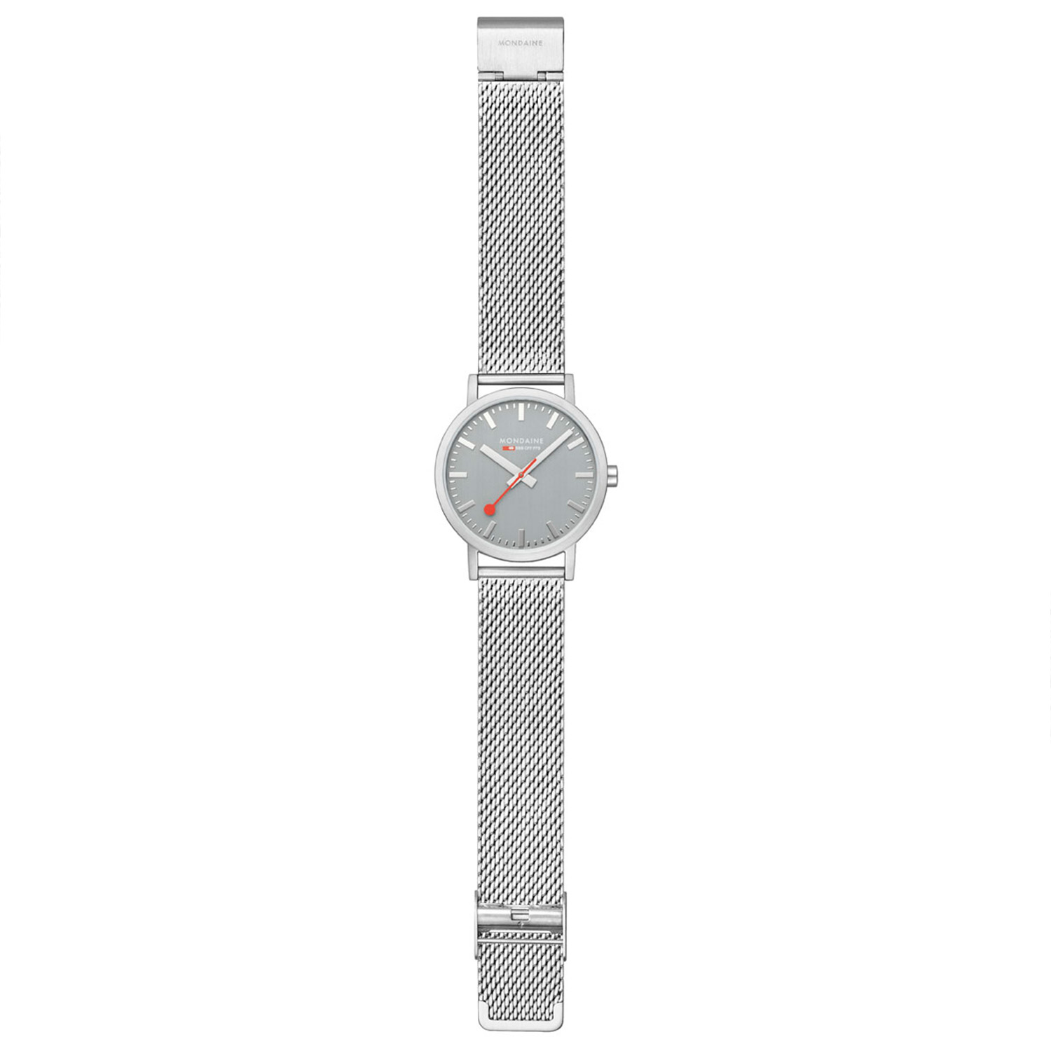 Dit unieke Mondaine dames horloge met nummer: M660.30360.80SBJ heeft een quartz uurwerk. Op de grijze wijzerplaat zijn de uren en minuten strepen duidelijk zichtbaar met als blikvanger de rode secondewijzer net als op een stationsklok. De zilverkleurige mesh band sluit mooi aan op de strakke zilverkleurige stalen ronde kast. Het horloge heeft mineraalglas is 36mm en 3 ATM.