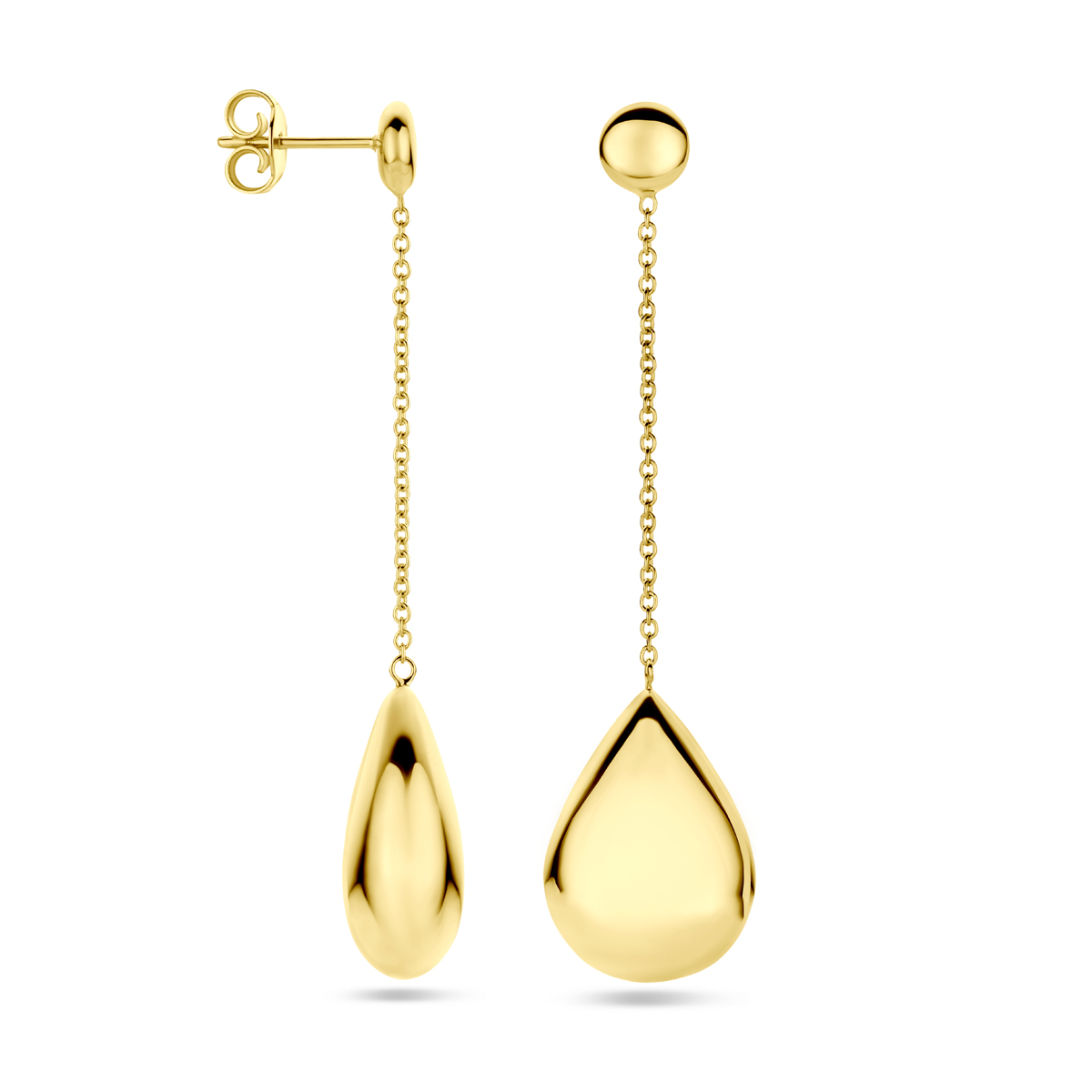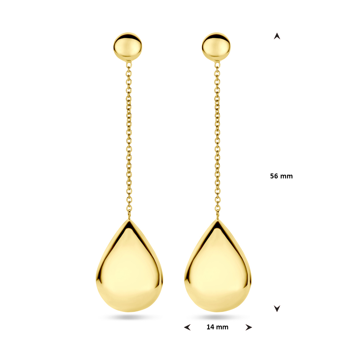 14k Geelgouden oorhangers uitgevoerd met een druppel. De oorhangers hebben een totale hoogte van 56mm.