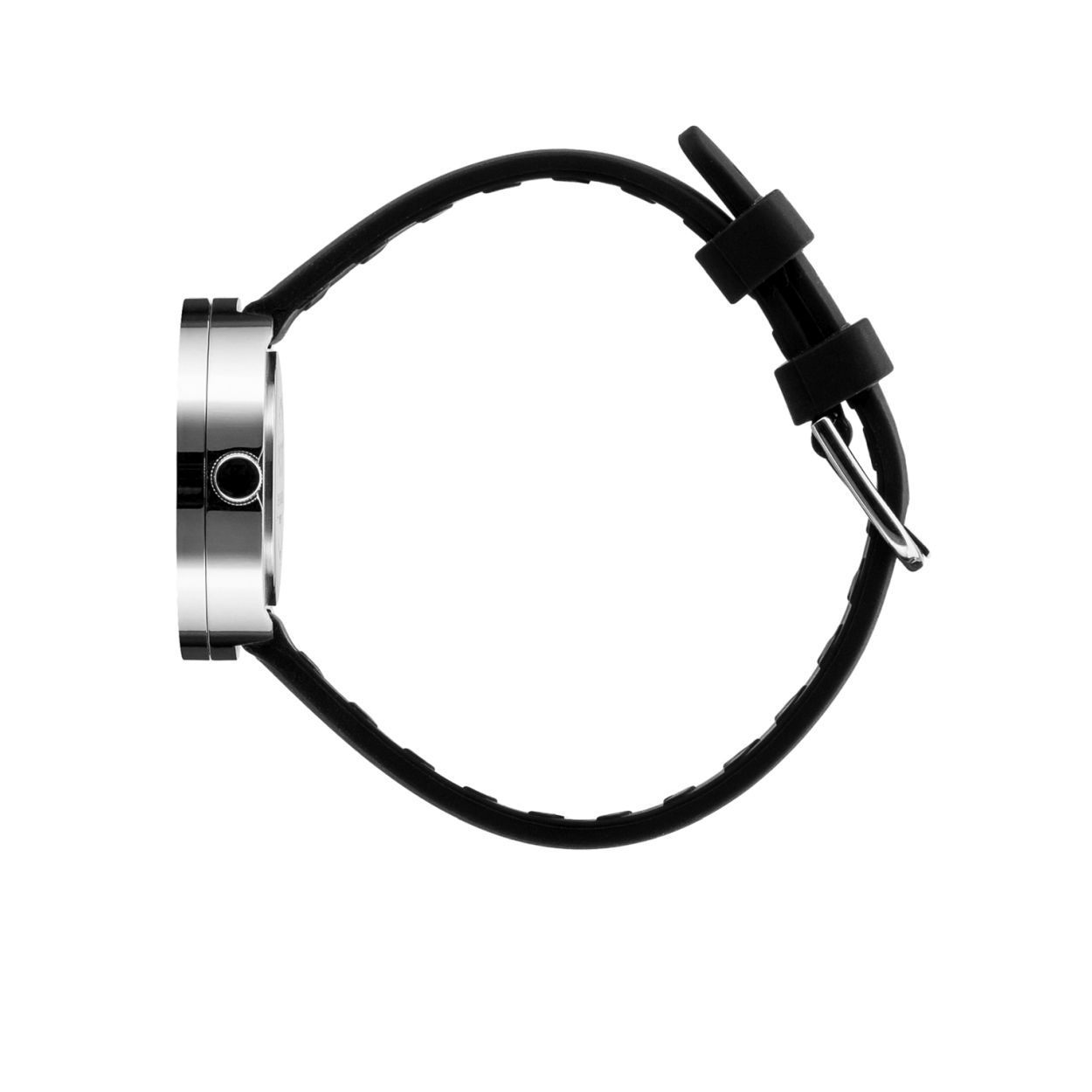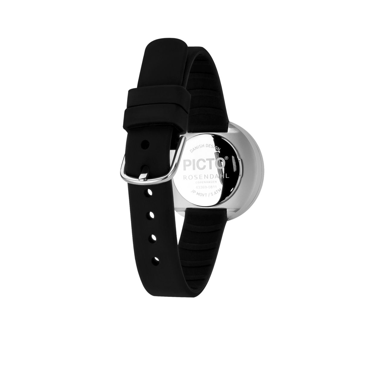 Dit zilverkleurige Picto dameshorloge met zwarte wijzerplaat heeft een minimalistisch en strak Scandinavisch design. De band van het horloge is van siliconen.
