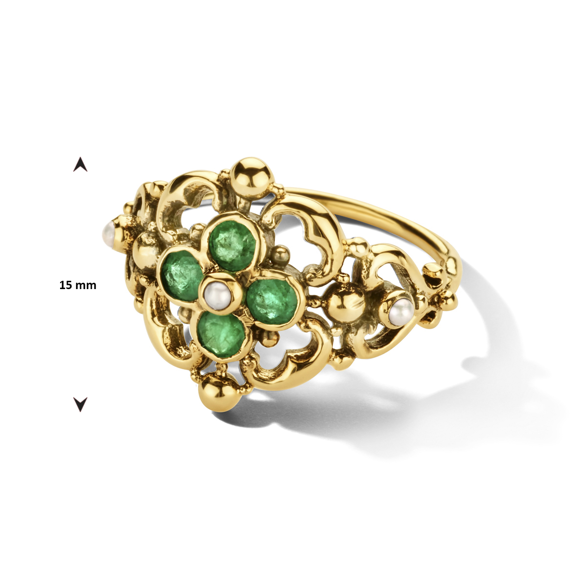 14k Geelgouden ring uitgevoerd met een schitterende smaragd stenen en parels. De ring heeft een breedte van 15mm. De smaragd stenen hebben een totaal steengewicht van 0.12ct.