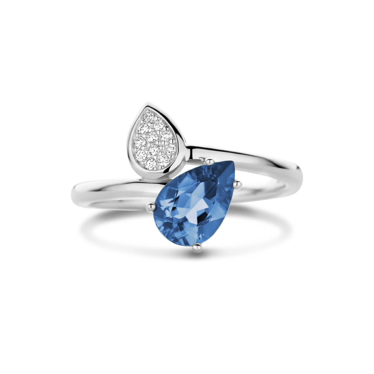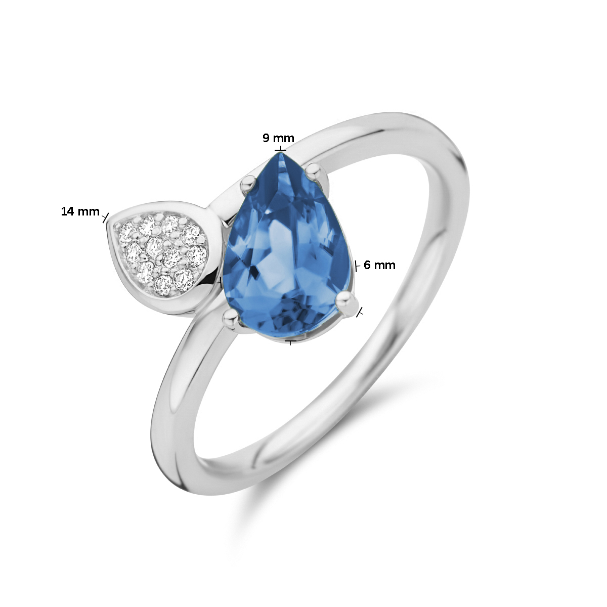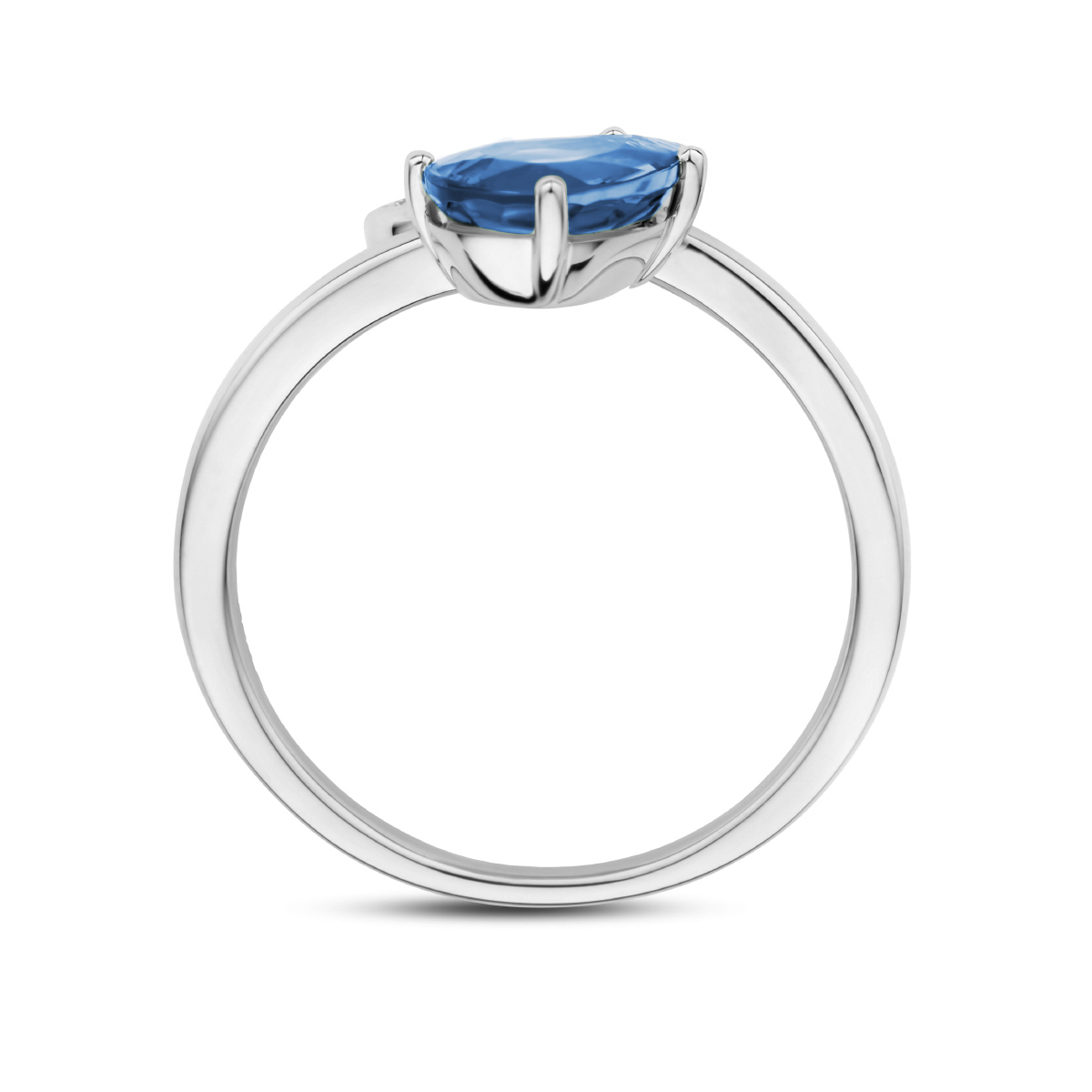 14k Witgouden ring uitgevoerd met schitterende London blue topaas en diamant. De ring heeft een afmeting van 14x10mm. De topaas heeft een steengewicht van 1.50ct en het diamantgewicht is 0.055ct.