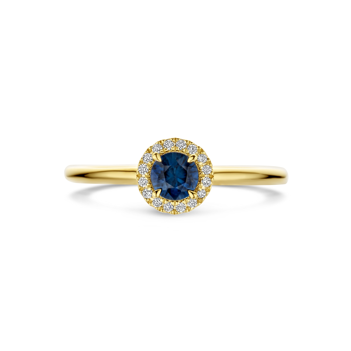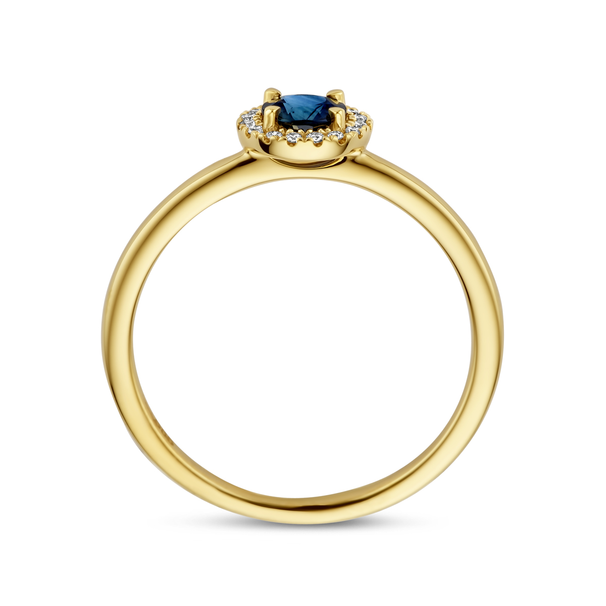 14k Geelgouden ring uitgevoerd met saffier en diamant. De ring heeft een breedte van 6.5mm. Het totale diamantgewicht is 0.05ct.
