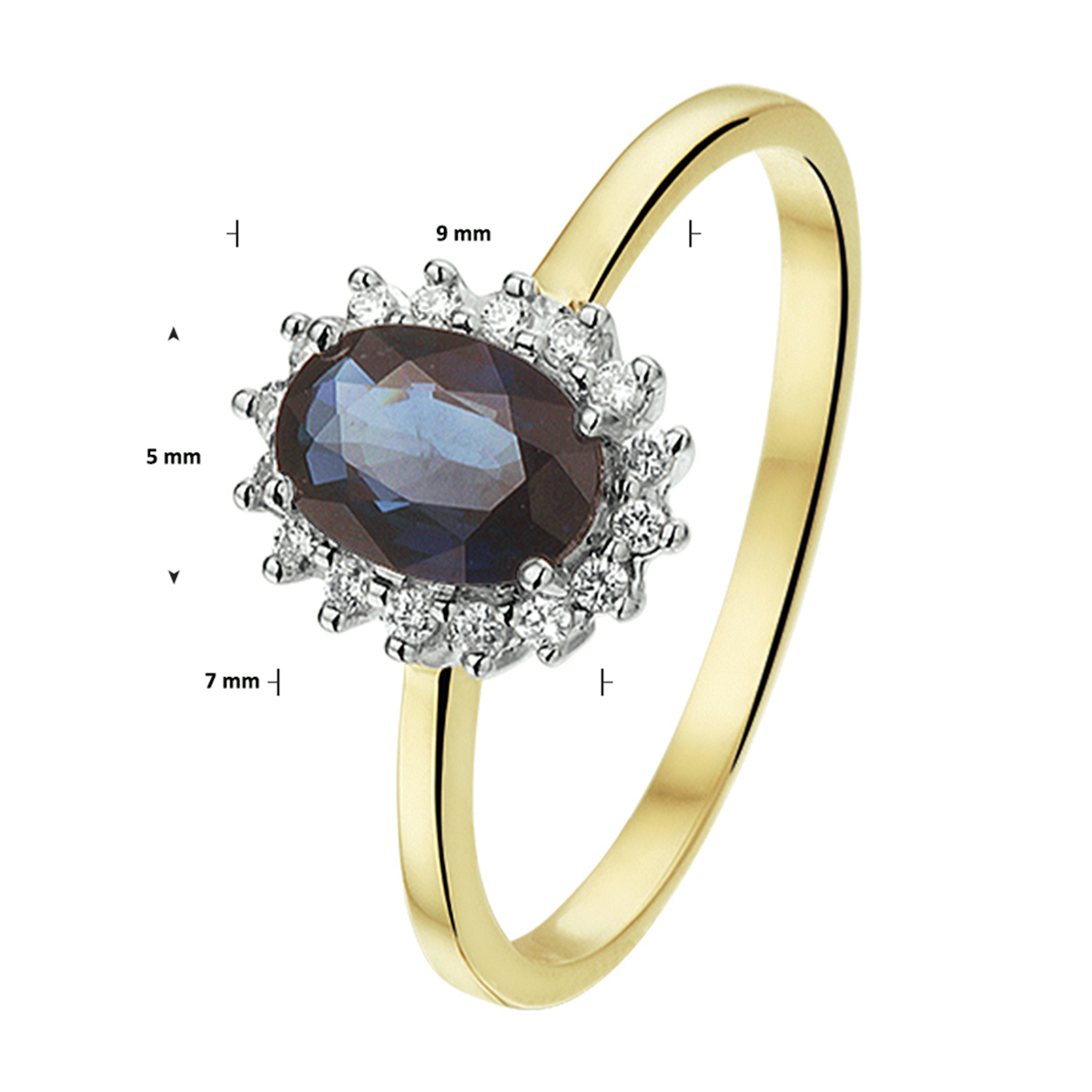 Chique bicolor geel en witgouden ring uitgevoerd met een saffier van 7x5mm en een luxe rozet van briljant geslepen diamant 0.11ct H SI. Deze elegante ring geeft uw outfit op een subtiele wijze een elegante uitstraling. Tip: Leuk om kado te geven. Diamonds are girls best friend!