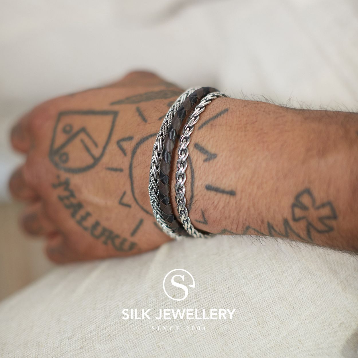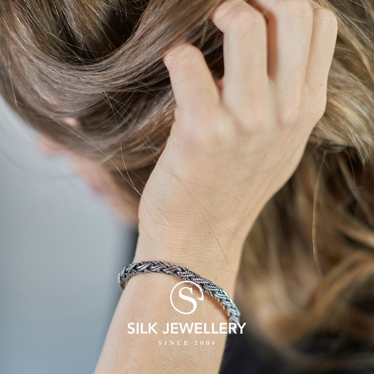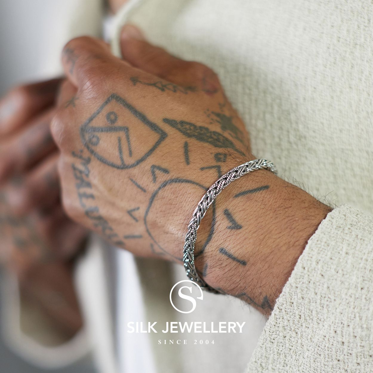De Double fox 372 armband van SILK Jewellery is een zeer verfijnd gevlochten zilveren armbandje wat sluit middels een bakslot. De gevlochten armband combineert twee stijlen in elkaar geweven vossenstaart structuren. Combineer tot een eigenzinnige creatie met bijvoorbeeld een lederen SILK armbandje of een van de andere smalle ronde armbandjes uit de SILK Jewellery collectie. SILK onderscheid zich met haar puur traditioneel vakmanschap en een verfrissend rebelse uitstraling. Hét eigenzinnige zilver merk heeft een zeer uitgebreide collectie handgemaakte sterling zilveren sieraden met zilver en leer. Haar zilver collectie staat bekend om haar massieve karakter, tijdloze stoere designs en verfijnde afwerking.