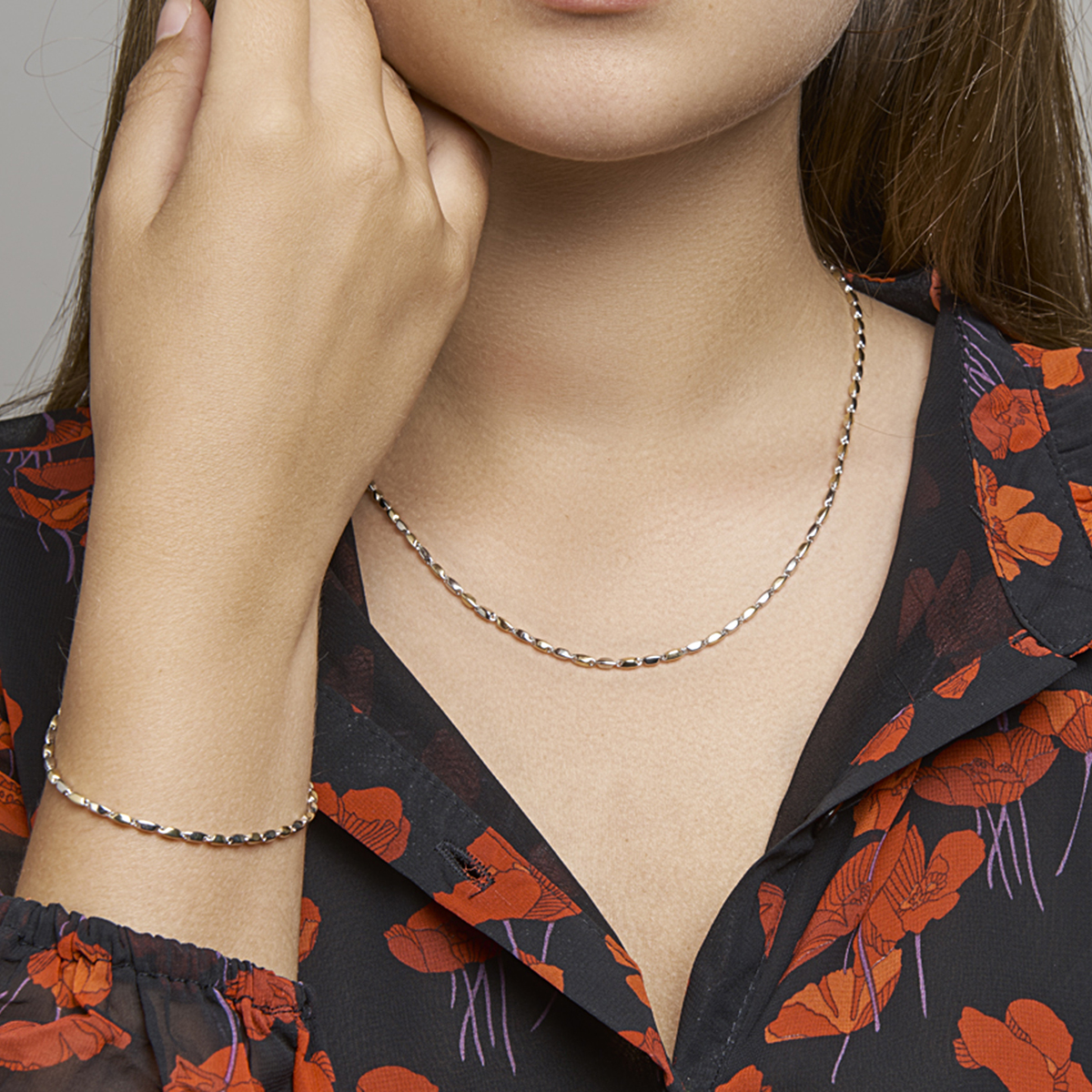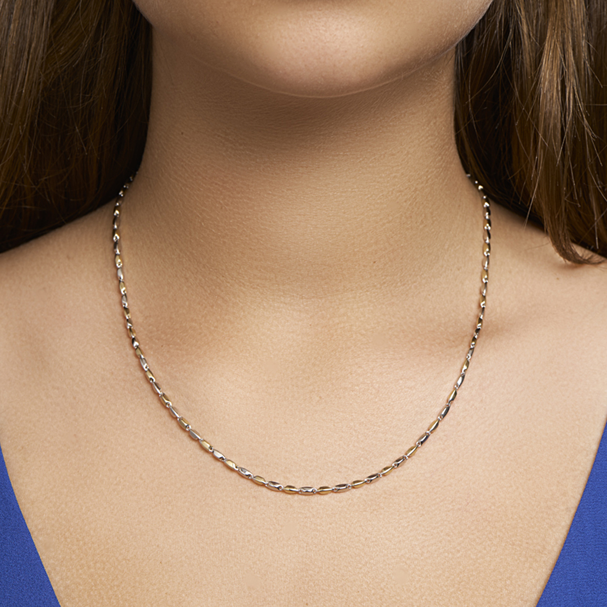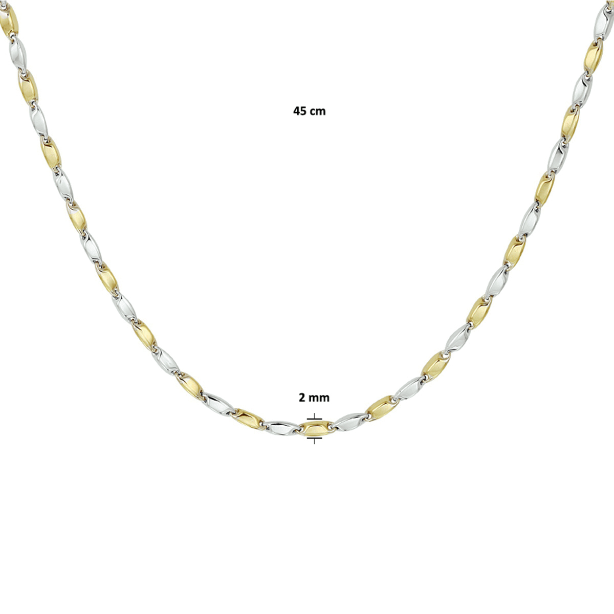 14k Bicolor geel- en witgouden collier uitgevoerd met een stevige karabijn sluiting. Het collier heeft een draaglengte van 45cm.