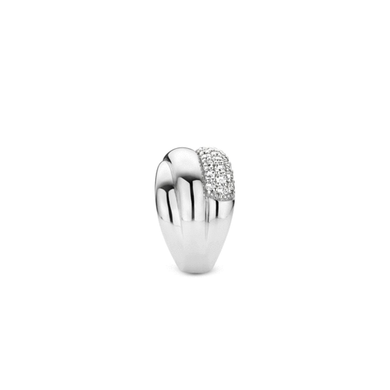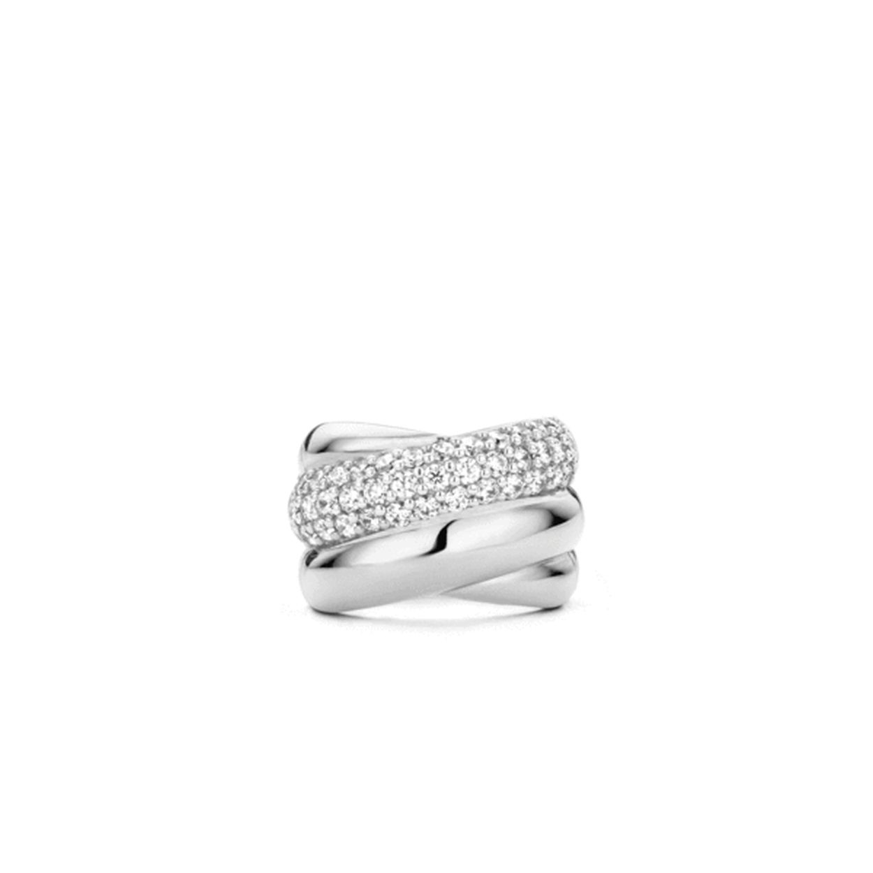 Deze iconische TI SENTO - Milano ring is gemaakt van gerhodineerd sterling zilver en gezet met witte zirkonia's. De chique ring is opgebouwd uit verschillende banden. De bovenste band is met zirkonia geaccentueerd. De ring is perfect te combineren met een paar klassieke oorbellen uit de TI SENTO collectie.