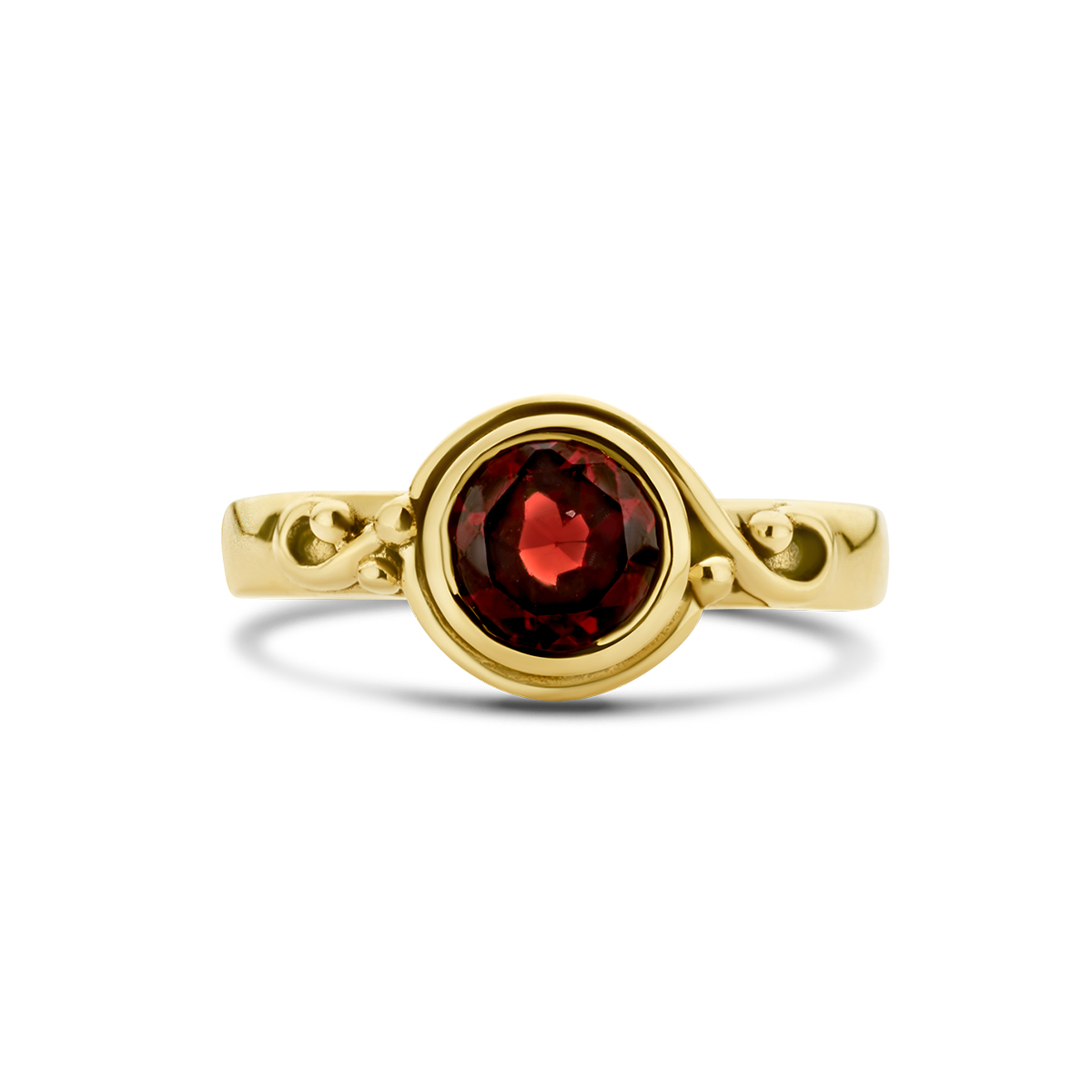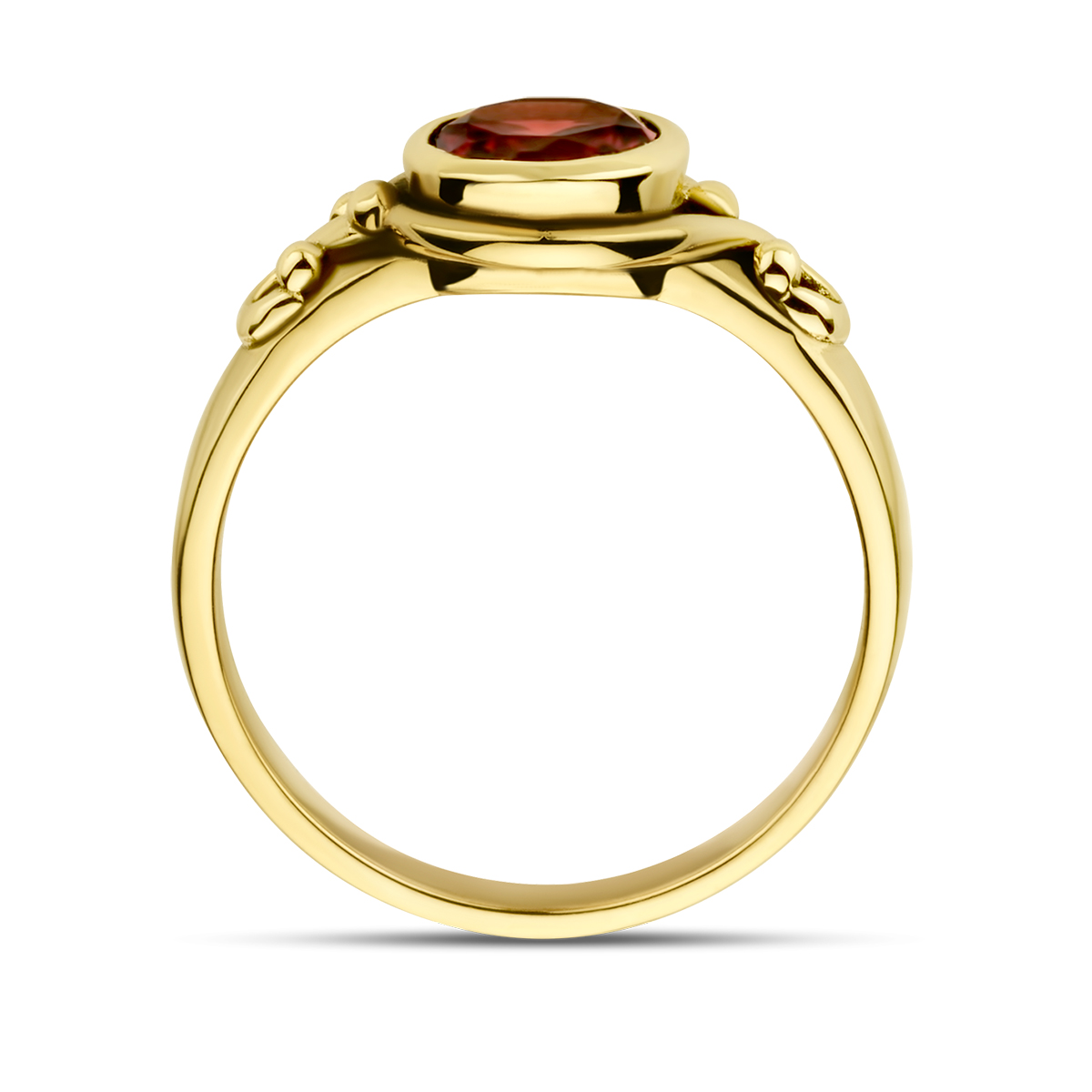 14k Geelgoudenvintagering uitgevoerd met schitterende granaat. De ring heeft een breedte van 9mm.